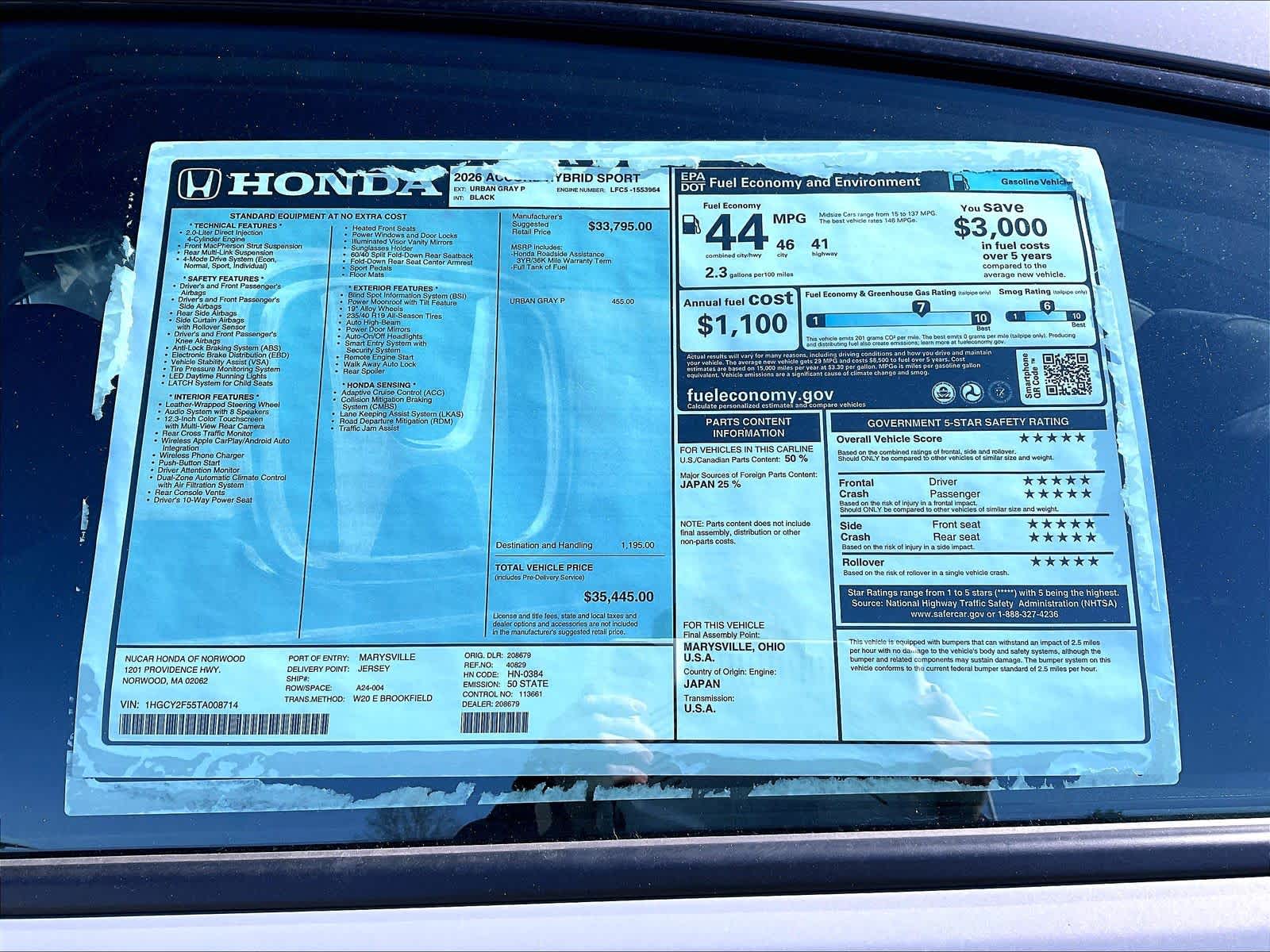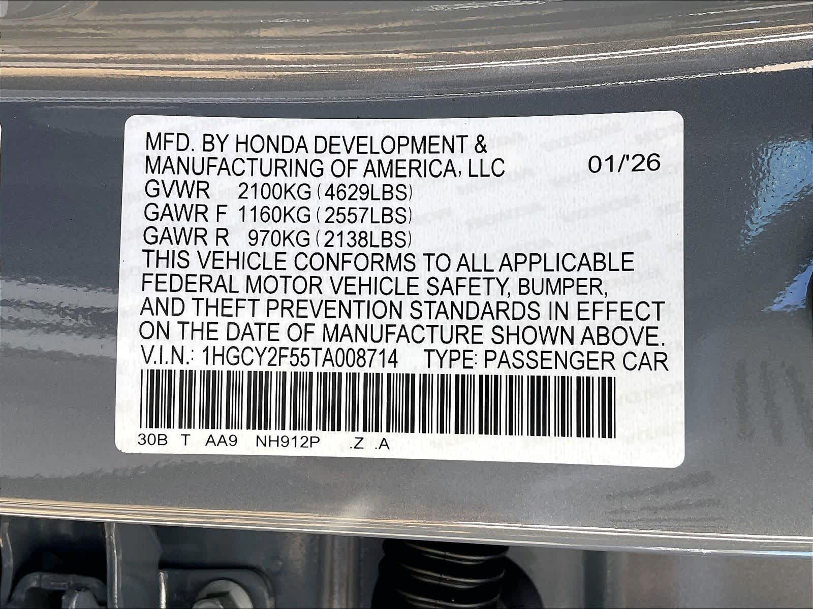 Sport | 3 milesStock # N0500556 | VIN # 1HGCY2F55TA008714